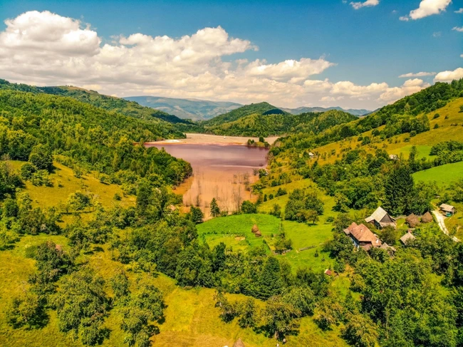 În prezent, se mai vede doar turla bisericii, lacul întinzându-se până în apropierea unui alt lăcaş de cult în satul Vinţa. Biserica de lemn de aici va fi înghiţită de steril dacă autorităţile nu vor lua o decizie privind strămutarea. Imagine din 2004. Sterilul nu ajunsese încă la biserică Schimbarea la faţă a zonei a început în anul 1977, când Nicolae Ceauşescu a decis să dea drumul exploatării de cupru de la Roşia Poieni. La acea vreme era cea mai mare din Europa.