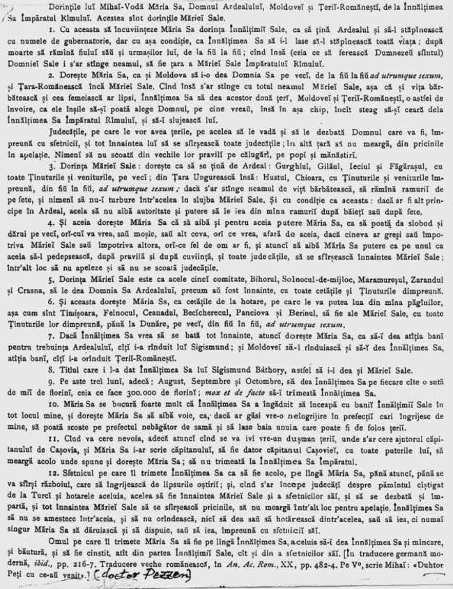 - Cu acestea să încuviinţeze Măria Sa dorinţa Înălţimii Sale, ca să ţină Ardealul şi să-l stăpânească cu numele de gubernatorie, dar cu aşa condiţie, ca Înălţimea Sa i-l lase să-l stăpânească toată viaţa, după moarte să rămână fiului său şi urmaşilor săi, de la fiu la fiu; când însă( ceea ce ferească Dumnezeu sfântul) Domniei Sale i s-ar stinge neamul, să fie ţara a Măriei Sale, Împăratul Râmului