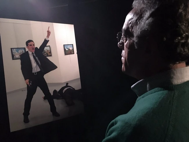 are un revolver îndreptat spre pământ. La stânga lui, la picioare, se află trupul victimei sale: ambasadorul rus în Turcia. Cel care ţine arma este Mevlut Mert Altintas, un ofiţer de poliţie tânăr de 22 de ani. Această fotografie ”icon” a lui Burhan Ozbilici, a devenit deja parte a istoriei vizuale a omenirii. De adăugat ar mai fi faptul că aceste premii au fost acordate ”fotografului şi nu crimei”.