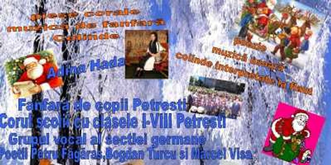 De asemenea, vor răsuna glasurile cristaline ale corului Şcolii din Petreşti, iar Georgiana Petrescu si Alina Bratu, câştigătoare a numeroase premii la concursurile de interpretare, vor colinda cântece specifice sărbătorilor de iarnă.
