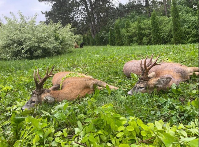 În fotografiile atașate postării sunt cei doi căpriori uciși pe o pajiște.