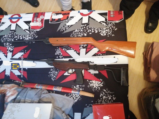 Cu ocazia perchezițiilor efectuate, polițiștii au ridicat două arme neletale, cu aer comprimat, deținute ilegal, mai multe plicuri cu substanțe susceptibile a fi droguri, precum și bunuri care ar proveni din furturi sau în legătură cu care există suspiciunea că ar fi fost folosite în activitatea infracțională.