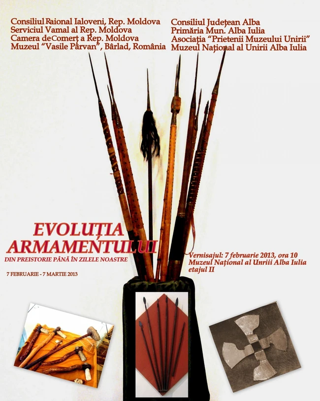 0Muzeul Naţional al Unirii Alba Iulia va vernisa joi, 7 februarie 2013, expoziţia „Evoluţia armamentului din preistorie până în zilele noastre”. Cu acaestă ocazie vor fi expuse peste 1.000 de arme, de o foarte mare valoare, care acoperă peste 6000 de ani de istorie.