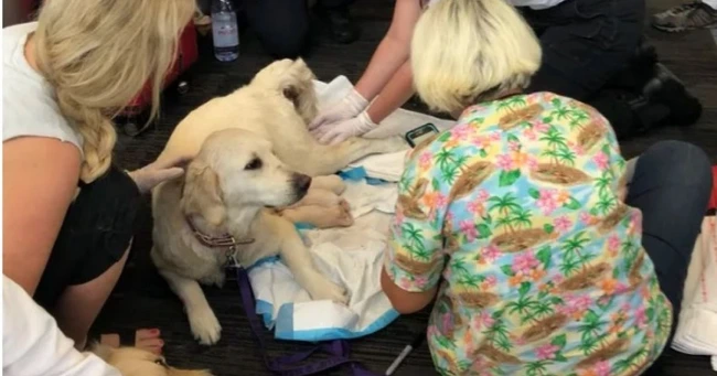 Căţeluşa Labrador Ellie/Eleanor urma să se îmbarce într-un zbor spre Philadephia cu Diane Van Atter, stăpâna sa, când a intrat în travaliu. Paramedicii de la aeroport au venit şi au asistat-o la naştere. Şi tatăl căţeilor părea agitat, notau cei de la 9gag.com. Potrivit sursei citate, cei 8 şi-au luat prima lor masă pe aeroport.
