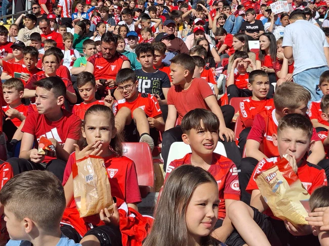 0Glasurile a mii de copii au răsunat, vineri, 5 aprilie 2024, pe Arena Francisc Neuman din Arad. Pentru unii dintre dintre micuți a fost prima dată când au participat la un meci de fotbal.