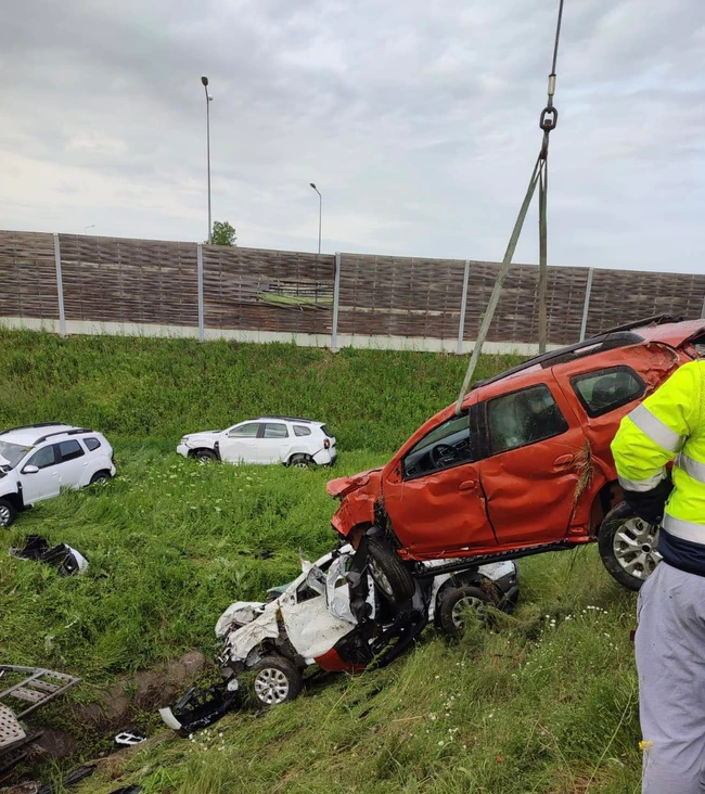 Autotrenul pe care îl conducea era încărcată cu autoturisme, care după răsturnare s-au împrășiat și ele.