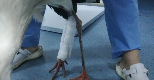 Barza şchioapă salvată: a fost dusă la cabinetul medical, iar veterinarul i-a pus atelă la picior