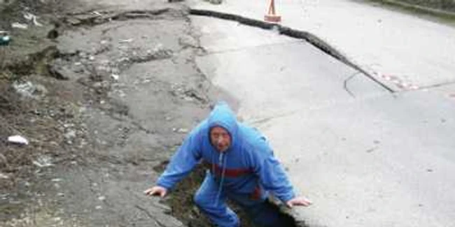 Şi răul a venit săptămâna trecută, când practic jumătate din şosea s-a surpat, lăsând în urmă un crater de circa zece metri pătraţi în care poate intra fără mari probleme un om.
