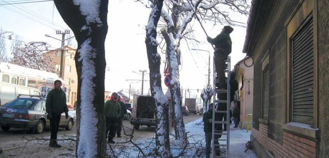 Pentru majoritatea muncitorilor, această perioadă este una de vacanţă, dar în municipiul Arad mai sunt şi oameni care lucrează. Câteva echipe de muncitori au ieşit în această dimineaţă pe teren, pentru a tăia crengile pline de zăpadă ale copacilor.