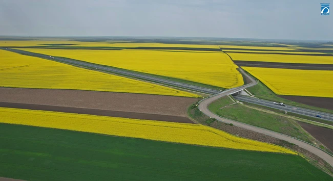 În imaginile splendide cu întinsele lanuri galbene de rapiță se poate vedea și o bucată din autostrada A 1 care serpuiește printre ogoare.
