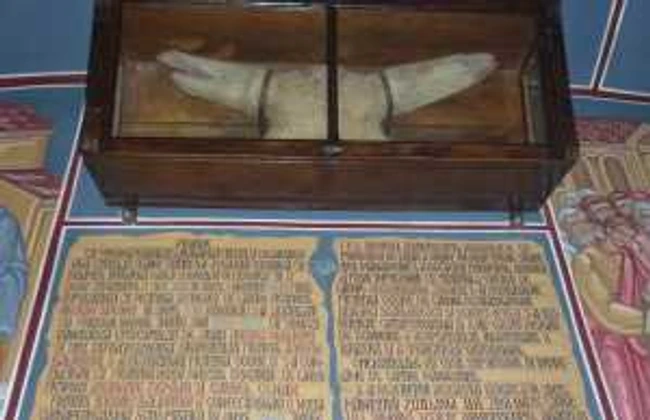 Cum intri în mănăstire, deasupra Altarului se află acea icoană găsită de Taur, iar lângă se află chiar coarnele taurului Hodoş.