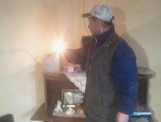 „Am fost debranşat de două ori într-un an de la curent pentru că nu pot plăti facturile. Sunt enorme. Eu nu am fabrică aici în casă, să zic că folosesc non-stop curent. Acum iar nu avem curent şi e foarte greu. Copiii vin de la şcoală şi trebuie să se grăbească să îşi facă temele înainte de întuneric, că apoi nu mai văd. Ca să avem lumină, avem o baterie de maşină la care am legat un bec mic. Tot aşa ne uităm şi la televizor. E legat la baterie. Ziua o încarc la serviciu şi până dimineaţa e descărcată”, a povestit Dumitru Grila, proprietarul casei.
