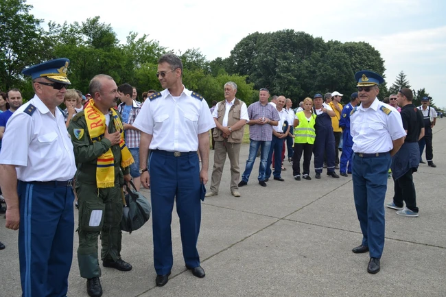După minute bune de reprezentaţie aviatică, în care MiG-ul a venit în picaj, s-a răsucit sau chiar a planat, în ciuda greutăţii şi altor caracteristici tehnice, generalul Cătălin Băhneanu a fost îmbrăţişat apoi de foştii colegi de la baza din Bacău.