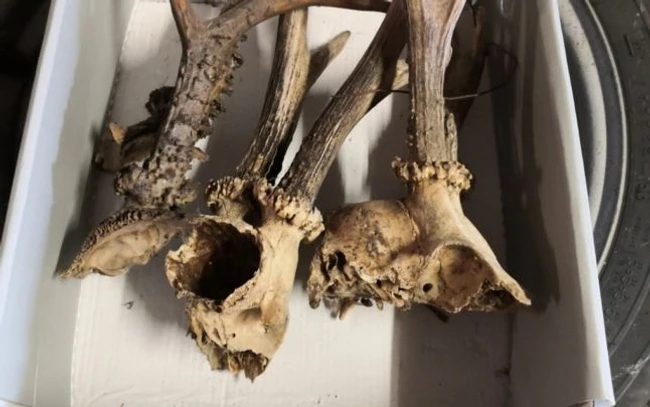 FOTO Trofee de căprior, arme de vânătoare şi muniţie, confiscate de la doi braconieri. Aceştia ţineau porci mistreţi în captivitate