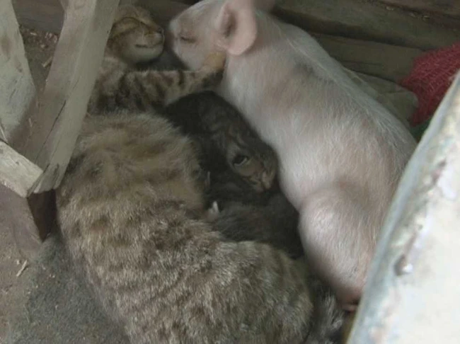 FOTO VIDEO O iubire incredibilă: pisica iubeşte un purceluş ca pe pisoii ei