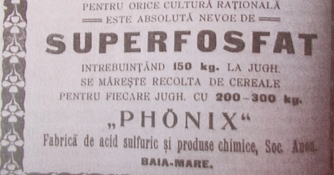 Potrivit acesteia, în perioada interbelică apăreau mai multe ziare, în care anunţurile publicitare încercau să facă cunoscute diferite produse, servicii, activităţi culturale etc., din Baia Mare. Astfel o reclamă din sectorul industriei grele vorbeşte despre un produs al Combinatului Phoenix, la acea vreme Fabrica de acid sulfuric şi produse chimice. ”Pentru orice cultură raţională este absolută nevoie de SUPERFOSFAT, deoarece întrebuinţând 150 kg la jugh se măreşte recolta de cereale pentru fiecare jugh cu 200-300 kg”, spunea anunţul (foto).