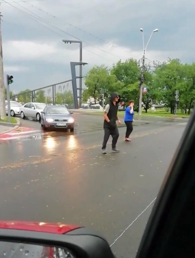 Cu gluga trasă pe cap, acesta încearcă să treacă de pe o parte pe alta a unui bulevard din Baia Mare. Dezorientat, abia reuşeşte să păşească pe carosabil.