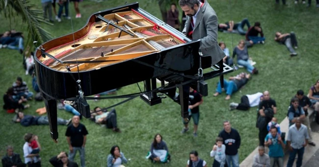 Organizatorii s-au folosit de nişte corzi pentru a-l lega pe artist şi pe pianul său şi l-au ridicat la 30 de metri de la sol. Concertul susţinut de pianist trebuia să se întindă pe 15-20 de minute, însă acesta s-a prelungit la aproape 40 de minute, din cauza unui incident cel puţin neobişnuit.