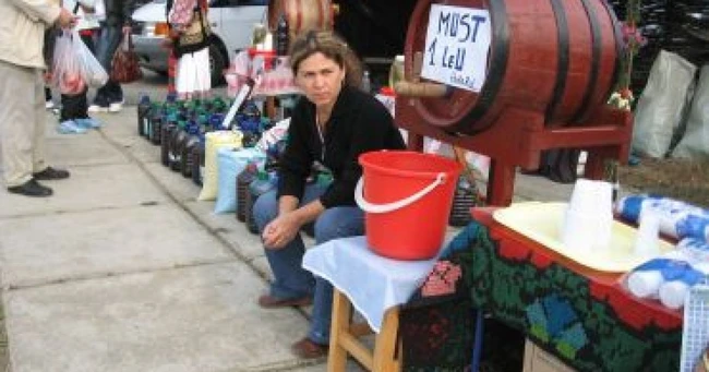 Recolta de struguri bogată din acest an se vede în zecile de litri de vin care aşteaptă să fie cumpărate la serbătoarea recoltei. Producătorii din tot judeţul vor să vândă tot ce au adus cu ei şi speră ca lumea să vină în Viişoara să cumpere. Mirela Năsălean este un producător de vin din Bidiu, comuna Matei. A venit, în această dimineaţă, cu 200 de litri de vin, 30 de litri de ţuică şi 600 de litri de must. „Nu prea a fost lume, până acum, dar de-abia am deschis. Sperăm să fie mai mulţi după-masă şi mâine. Marfă avem multă şi sperăm să şi vindem. Anul trecut, am dat 200 de litri de vin numai în prima zi de târg“, spune producătorul aşezat chiar la intrarea în Oborul de la Viişoara.