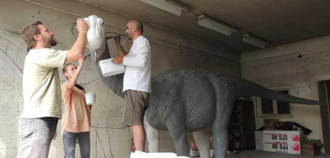 În cel de-al doilea atelier au lucrat la ouăle de dinozaur. Au fost făcute pe jumătăţi, după care au fost sudate. După ce au sudat cele două jumătăţi, sculptorii au constatat că nu încăpeau pe uşa de la atelier. Aşa că au fost nevoiţi să le desfacă şi să le sudeze din nou în cel de-al treilea atelier, care avea şi spaţiu, şi uşi mai largi.