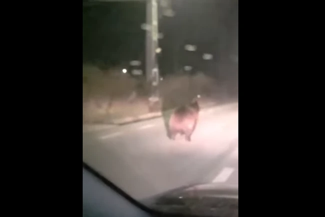 În înregistrare se vede cum ursul aleargă derutat pe stradă, iar, la un moment dat, dispare într-o zonă cu vegetație înaltă.