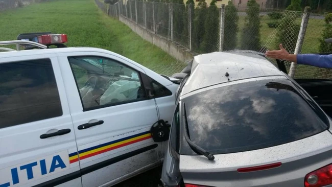 „Maşina de poliţie era în depăşire, doamna s-a pierdut când a auzit sirenele, a intrat în faţa maşinii de poliţie şi a luat-o în plin şi a băgat-o în gard. A fost maxim două minute toată treaba”, declară unul dintre martori.