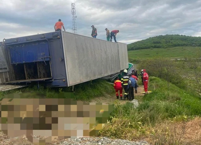 "Se lucrează pentru asigurarea accesului şi extragerea ovinelor din toate compartimentele autocamionului", a transmis ISU Bistriţa-Năsăud.