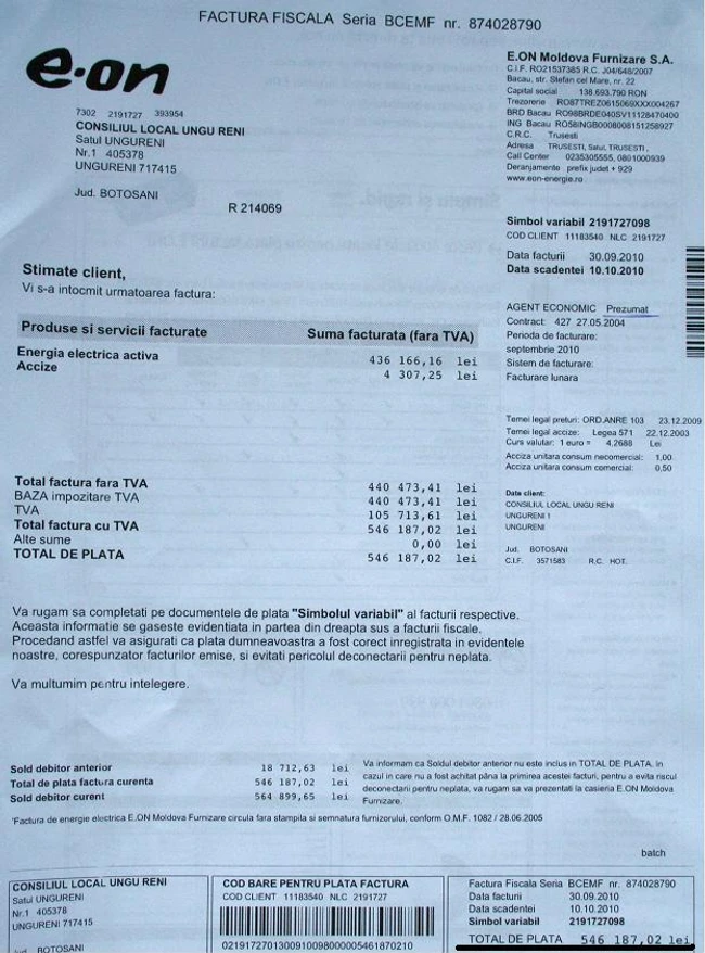 Factura record, de 546.187 lei, a ajuns pe masa primarului comunei Ungureni luni dimineaţă. De atunci edilul localităţii nu mai are bună stare şi încearecă să găsească un răspuns la E.on pentru a lămuri cum este posibil ca o şcoală sătească să consume cât o uzină. „Vă daţi seama că am rămas fără cuvinte când am văzut factura. Am încercat să găsesc explicaţii şi am făcut tot felul de calcule. Ar fi trebuit ca şcoala să consume aproape un milion de kilowaţi ceea ce era imposibil. Este consumul pe 300 de ani. De la E.on ne-au comunicat că dacă plătesc factura o să se considere plata făcută în avans pentru perioada care urmează. " a declarat Ilie Ivanache, primarul comunei Ungureni.