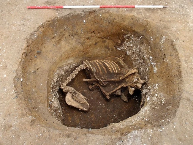 Totodată, oasele cailor nu au fost pur şi simplu aruncate într-o groapă, ele beneficiază şi de inventar funerar. ”Deasupra gropii, la 5-10 cm, spre centrul ei, au fost descoperite două pietre şi fragmentele unui vas a cărui formă nu a putut fi reconstituită, din pastă neagră, cu slip brun-cărămiziu pe suprafaţa exterioară, cu degresant din cioburi pisate şi rare bucăţi de calcar, ce poartă un decor incizat, cu triunghiuri haşurate. În vasul ce prezintă pe suprafaţa exterioară urme de arsură s-a aflat un os de animal. Un mic fragment de la acest recipient a fost descoperit pe fundul gropii, printre oasele celor doi cai”, arată Burtănescu.