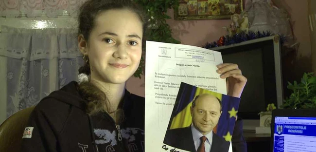 Elevă de 10 la şcoala din sat, Lavinia s-a gândit că singurul care îi poate rezolva problemele este chiar preşedintele României. Aşa că îi scrie de fiecare dată când are nevoie de ajutor, de un sfat sau pur şi simplu să îi amintească şefului statului ce se mai întâmplă în satele din ţară. „ Ideea mi-a venit în clasa a V a. L-am cunoscut pe domnul preşedinte în timpul indundaţiilor şi mi s-a părut un om cumsecade.A spus că ne va ajuta ori de câte ori avem nevoie", spune fetiţa.