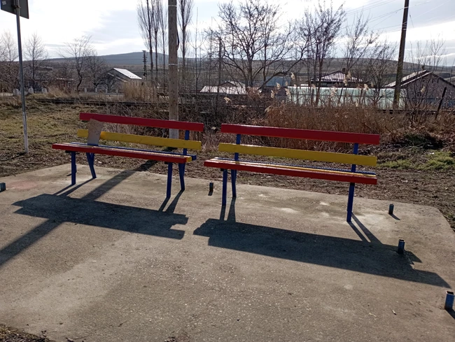 Patriotism utilitar: bănci în culorile drapelului național în fața tuturor gospodăriilor dintr-o comună din Botoșani