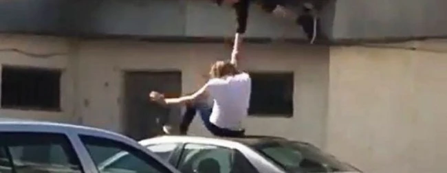 Nici măcar strădania prietenului de pahar nu l-a ajutat foarte mult. Din contră la un moment tânărul care nu reuşea să urce, într-o forţare de ultim moment se prăbuşeşte peste autoturismul parcat şi îl trage şi pe partenerul său direct peste cupola maşinii şi mai apoi pe asfalt. Întâmplarea a stârnit hohotele de râs ale trecătorilor care au şi filmat păţania.