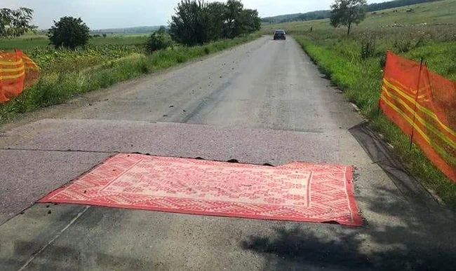 Covoare îmbibate cu dezinfectant contra pestei porcine puse de-a latul străzii în mijlocul pustiului