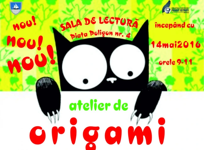 Biblioteca Judeţeană „Panait Istrati” din Brăila organizează, începând cu data de 14 mai 2016, cursuri de origami. Vor fi câte două ateliere, coordonate de bibliotecarii Carmen Damian şi Gabriela Popescu, în limita a câte zece locuri de fiecare.