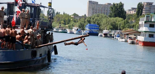 Jocurile marinăreşti au fost patronate de zeul Neptun, întruchipat, ca în fiecare an, de actorul brăilean Florin Chirpac. Sub supravegherea zeului, a primit botezul apei un tânăr "ghiborţ", înrolat recent în Flotila Fluvială, care a fost săpunit bine, "bărbierit" cu un ditamai briciul din lemn, apoi udat din cap până în picioare.