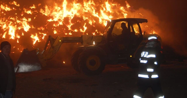 Nu mai puţin de 5.000 de baloţi de paie s-au aprins după ce proprietarul, un crescător de animale din localitate, i-a acoperit cu o folie de plastic.
