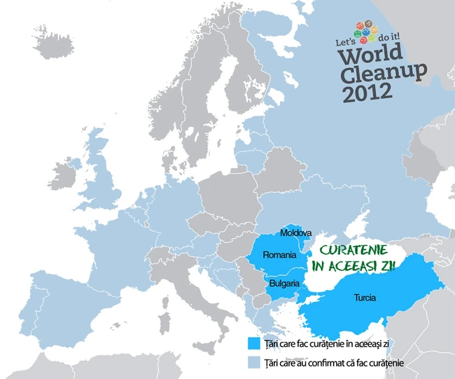 0În 2012, peste 85 de țări din întreaga lume vor organiza o zi de curățenie generală, în perioada 24 martie-25 septembrie. România este pe harta mondială - Ziua de Curățenie Națională este 12 mai, zi în care vor mai face curățenie și Bulgaria, Republica Moldova şi Turcia.