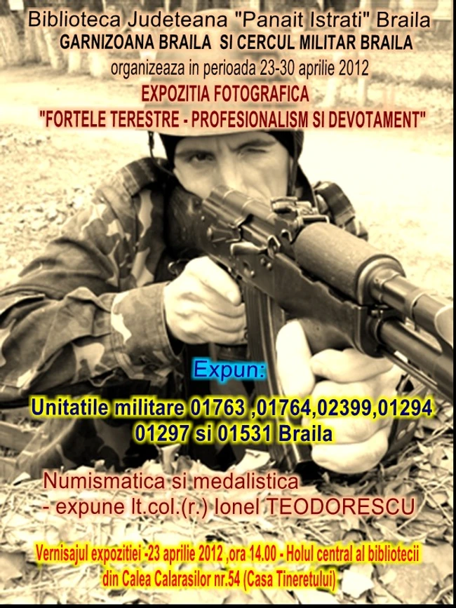 CERCUL MILITAR BRĂILA în colaborare cu CLUBUL SENIORILOR DIN ÎNVĂŢĂMÂNT BRĂILA organizează JOI, 26 aprilie 2012,ora 13.30, în Sala de spectacole a Cercului Militar Brăila, lansarea romanului "Invalidul", de col.prof.univ.dr. MIRCEA VLADU.