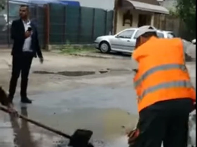 VIDEO Dorei de Brăila. Cum acoperă în bătaie de joc muncitorii gropile pline cu apă cu mixtură asfaltică