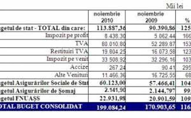 În structură, pe bugete şi în cadrul bugetului de stat pe principalele impozite şi taxe, situaţia privind realizarea veniturilor în luna noiembrie, faţă de realizările pe aceeaşi perioadă a anului 2009, se prezintă astfel: