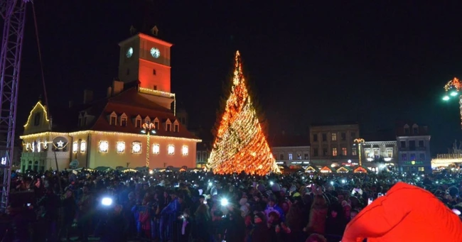 Braşovul a redevenit Oraşul din Poveste. Bradul de 28 de metri are 50.000 de beculeţe, 800 de globuri şi 600 de metri de beteală FOTO
