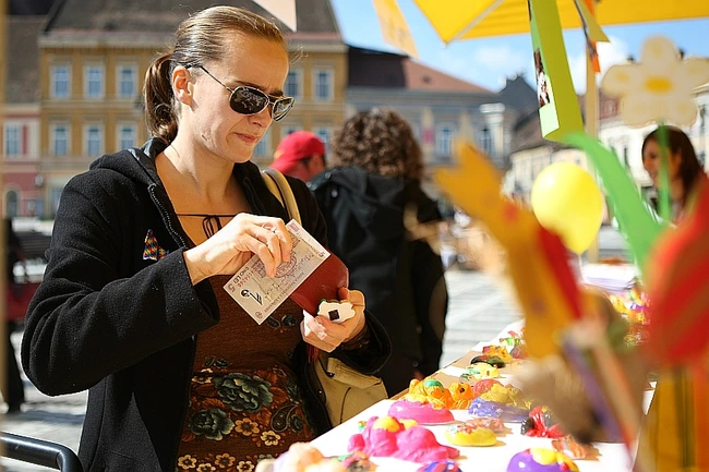 Ajutaţi şi îndrumaţi îndeaproape de părinţii lor, micuţii şi-au expus creaţiile în Piaţa Sfatului. Braşovenii au făcut donaţii pentru obiectele ce le vor înfrumuseţa casa de Paşte.