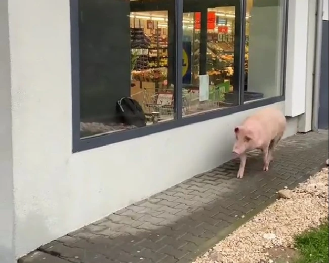 Incidentul s-a petrecut vineri, când animalul a apărut în fața ușilor automate ale magazinului Lidl. Porcul părea hotărât să intre, dar ușa nu s-a deschis, în timp ce un câine din apropiere îl lătra insistent. După câteva încercări eșuate, suina a făcut un ocol, dar s-a întors din nou spre intrarea principală.
