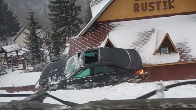 O mașină a derapat și a ajuns pe acoperișul unei pensiuni din Predeal. Imaginile spectaculoase au șocat internetul