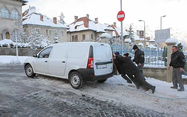 „De dimineaţă am împins vreo 20 de maşini. Puţini şoferi reuşesc să iasă din zona aceasta cu gheaţă“, este de părere Petrică Toader, gardian public.