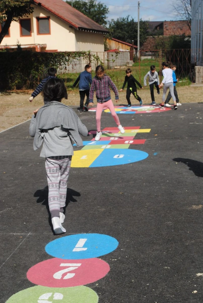 De asemenea, o şcoală gimnazială din Râşnov a pus bazele altui proiect inedit care vine în sprijinul elevilor din clasele mici să înveţe prin joc. Câteva desene cu rol de jocuri interactive, între care şi celebrul „şotron” al copilăriei, au fost marcate pe asfalt în curtea şcolii, astfel încât celor mai mici să le fie mai uşor să înţeleagă aritmetica, dar şi pentru a se dezvolta din punct de vedere fizic. „Odată cu refacerea curţii, când am delimitat şi un careu pentru intrarea elevilor în şcoală, ne-a venit şi idea jocurilor. Am căutat, ne-am documentat şi am văzut că astfel de modele există atât în ţară cât şi în străinătate, în parcuri sau în curţile unităţilor de învăţământ. Momentan avem trei jocuri, unul pe care se pot face chiar lecţii de matematică, cu diverse operaţii cu cifre, acesta pretându-se la clasele primare. Celelalte două sunt dedicate dezvoltării părţii fizice, cu sărituri, mobilitate şi aşa mai departe. Pot fi utilizate în timpul orelor de educaţie fizică şi sport”, a precizat prof. Oana Cheţe, director al Şcolii Gimnaziale nr. 3 Râşnov.