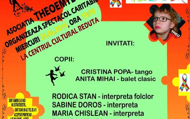 0Asociaţia THEOEMYDOR Braşov organizează miercuri, 25 iunie 2014, de la ora 18.00, la Centrul Cultural „Reduta”, un spectacol caritabil dedicat lui Theo, băieţelul de 4 ani şi 10 luni, care suferă de autism, dar şi altor copii de diferite vârste având acelaşi diagnostic.