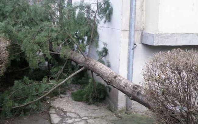 Vântul puternic a rupt un brad de 12 metri care a căzut pe faţada unui bloc