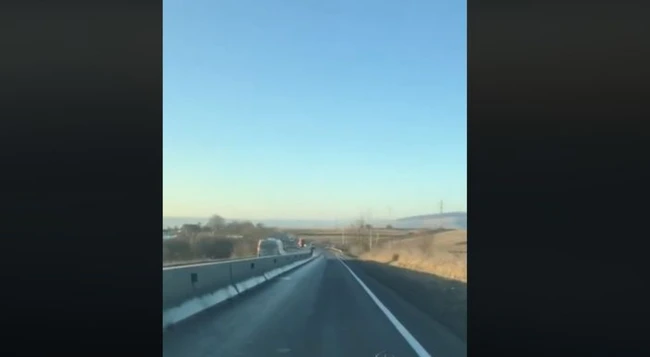 Bărbatul a făcut o depăşire extrem de periculoasă chiar înainte ca drumul să fie despărţit în două de un parapete şi a fost nevoit să o ţină tot aşa până s-a terminat zidul despărţitor. A avut şansă, pentru că a reuşit să revină pe partea corectă exact la timp, când din faţă a apărut un TIR.