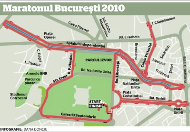 Maratonul Bucureşti va avea loc duminică şi se va desfăşura pe traseul Piaţa Constituţiei - B-dul Unirii - Piaţa Constituţiei - Piaţa Naţiunilor Unite - Calea Victoriei - Strada Ion Câmpineanu - Splaiul Independenţei - Opera Română - Podul Eroilor - Strada Ştirbei Vodă - Strada Izvor - Calea 13 Septembrie - Piaţa Constituţiei. Organizatorii maratonului au anunţat că accesul rutier va fi interzis pe durata desfăşurării evenimentului, între orele 7.00 şi 16.00.